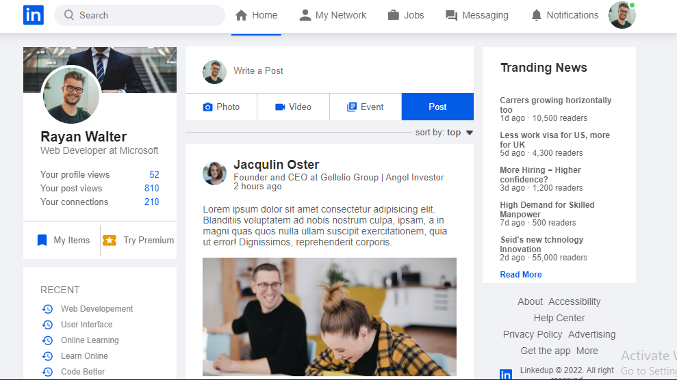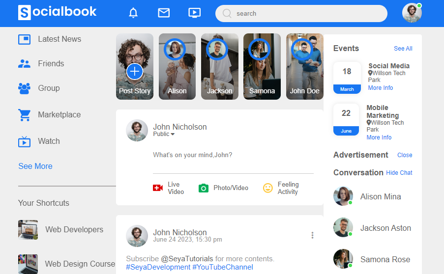 SocialBook: A minimalist front-end social media site like Facebook. Features Home & Profile pages, dark mode, and responsive design.